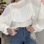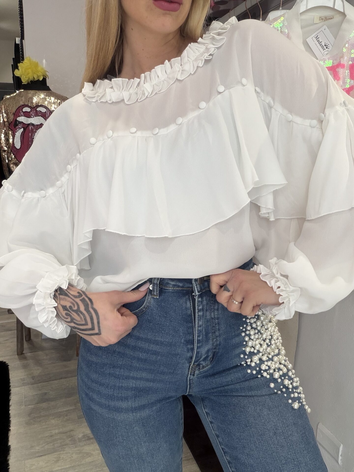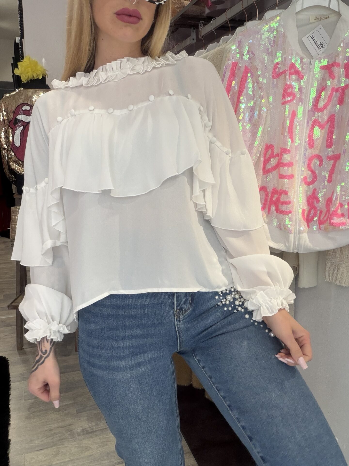 Camicetta con scollo leggermente a barchetta , con particolarità di avere anche i pon pon sulla parte davanti – taglia unica veste fino 44
