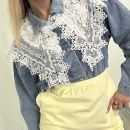 Può essere usata sia come giacca in Denim, sia come camicia come nelle foto, abbinandola a una gonna tubino. Molto particolare per le applicazioni di strass pizzi e merletti.