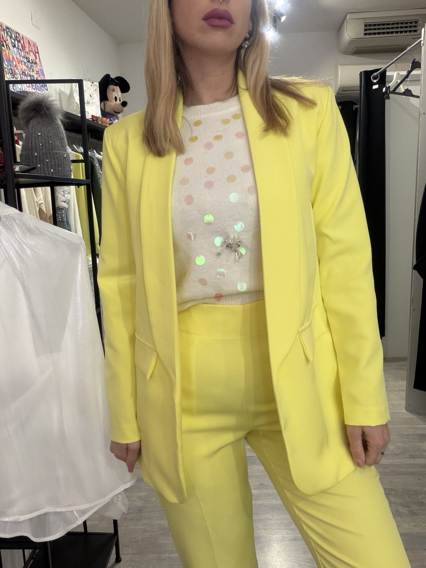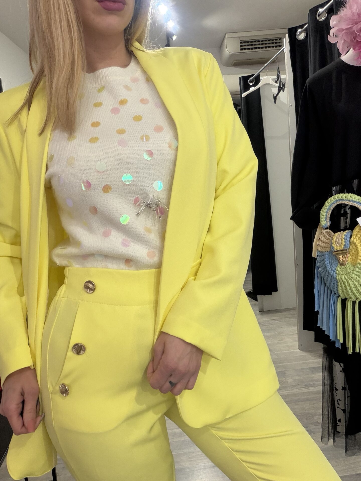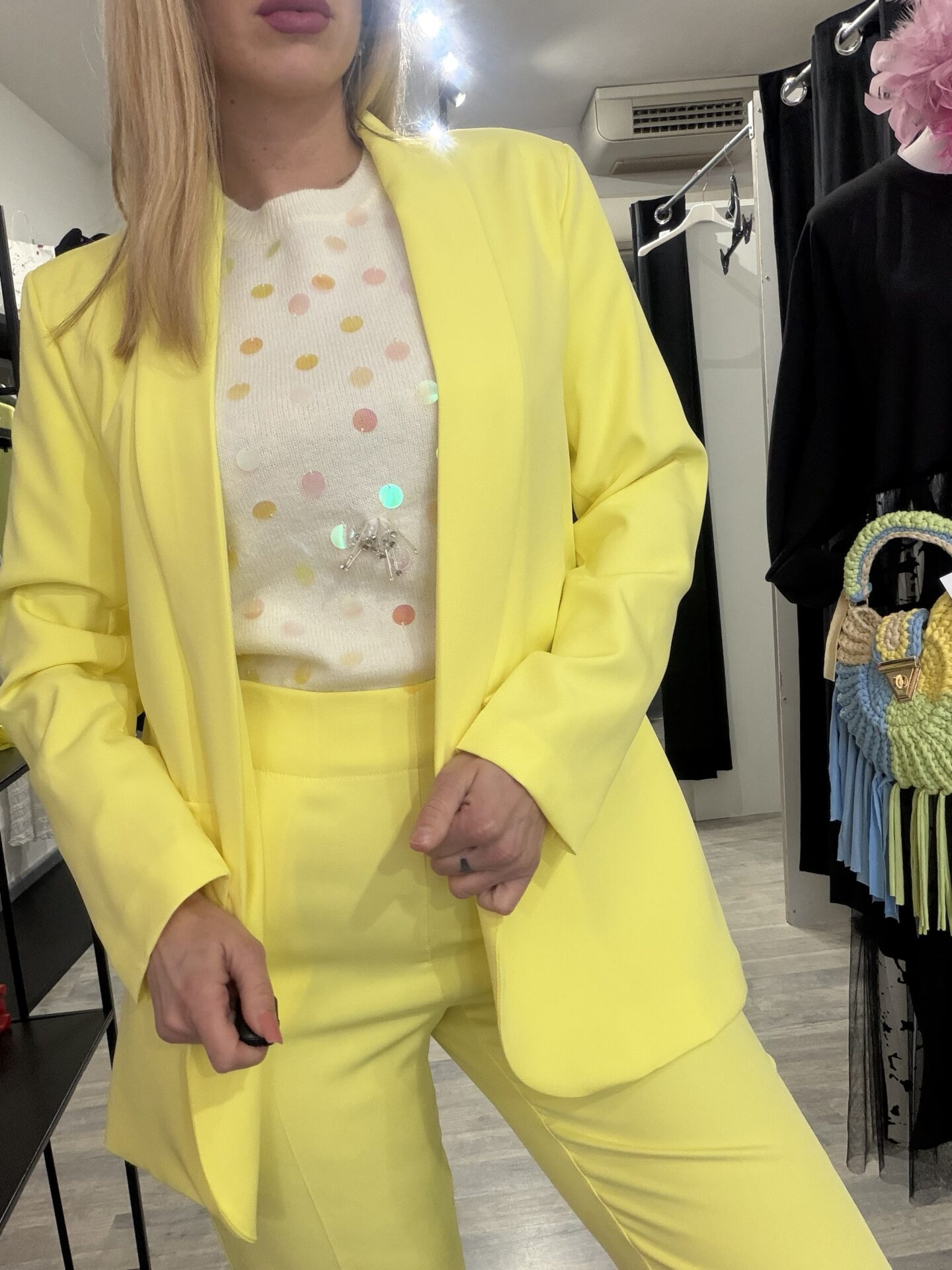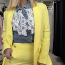 Tailleur moderno destrutturato, composto da blazer senza bottoni, morbido e dalla linea molto fluida, a differenza del classico tailleur. Realizzato in tessuto leggero.