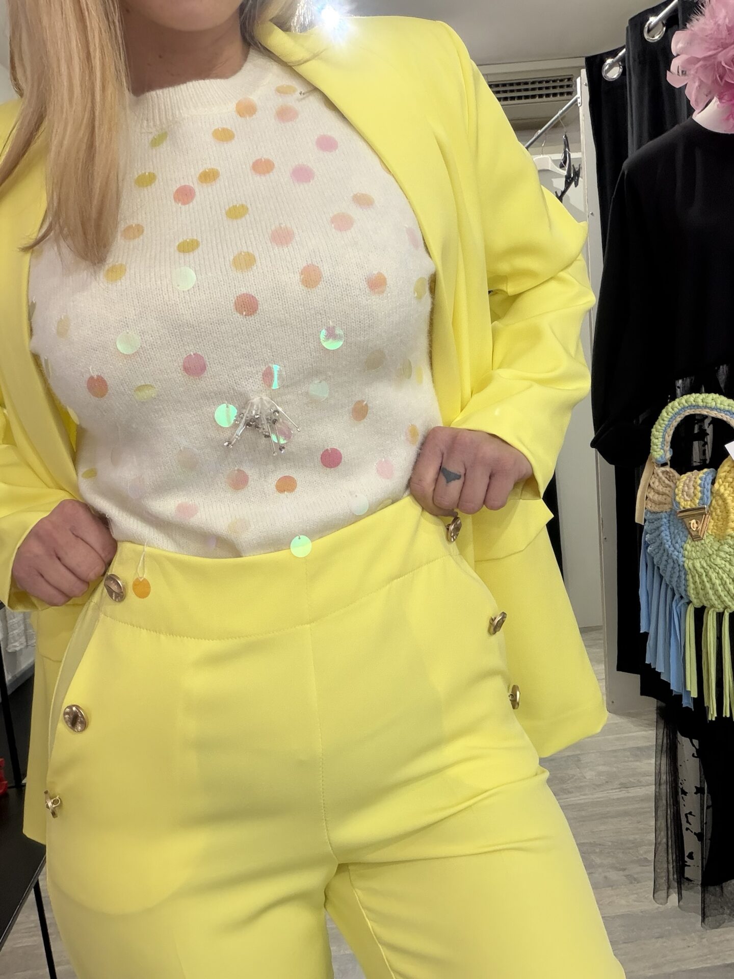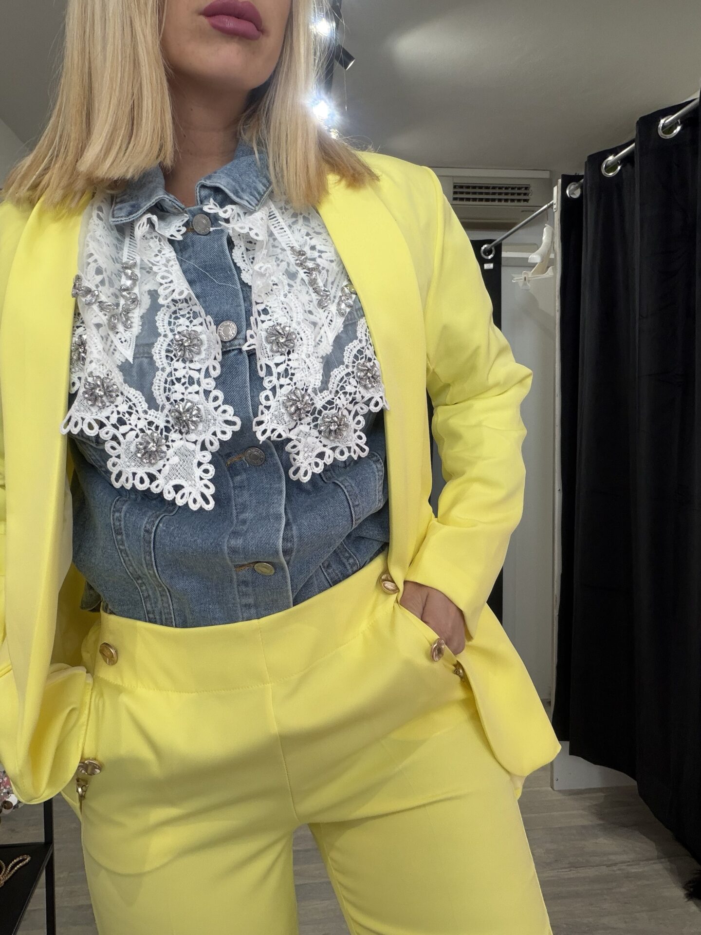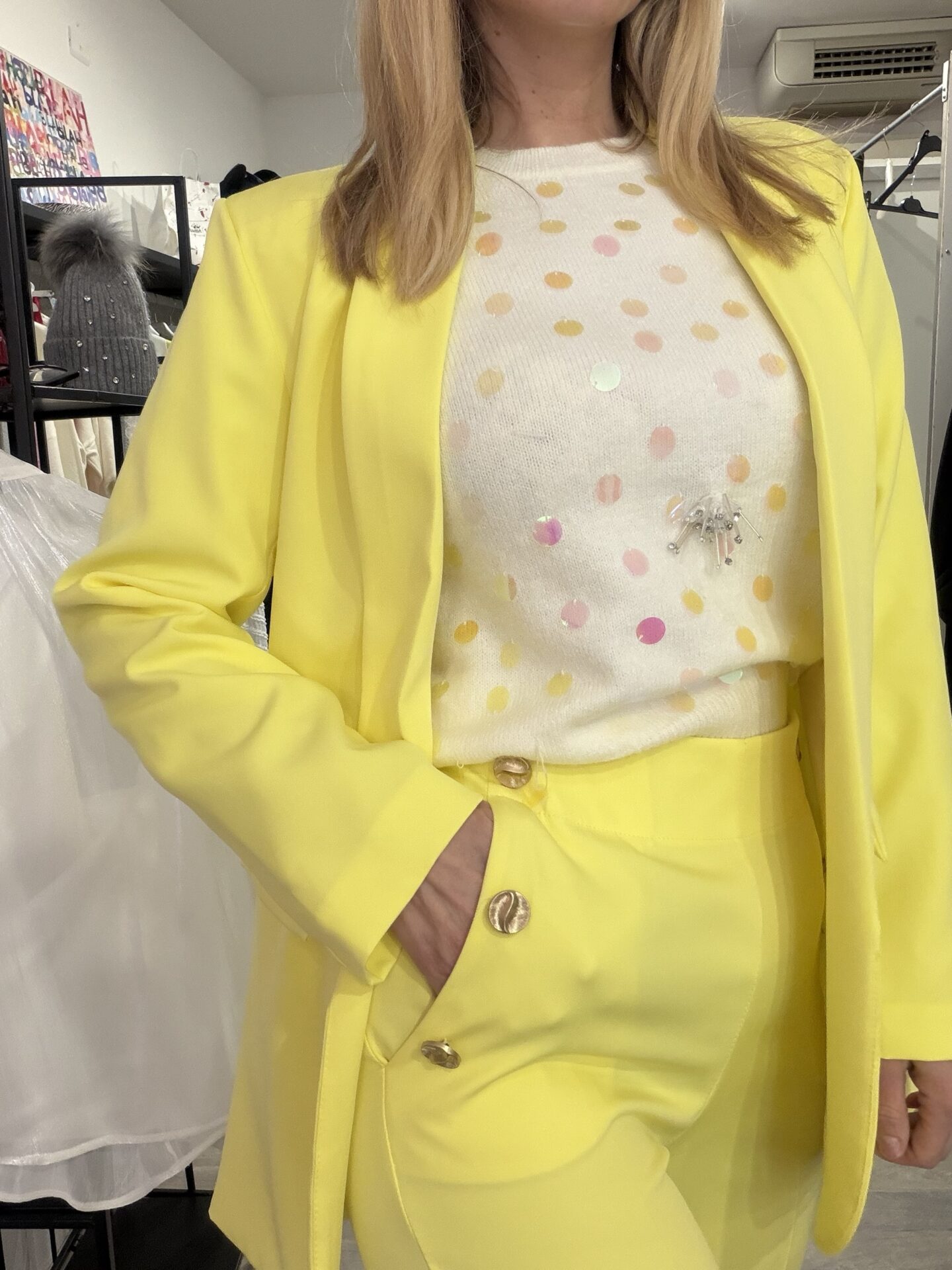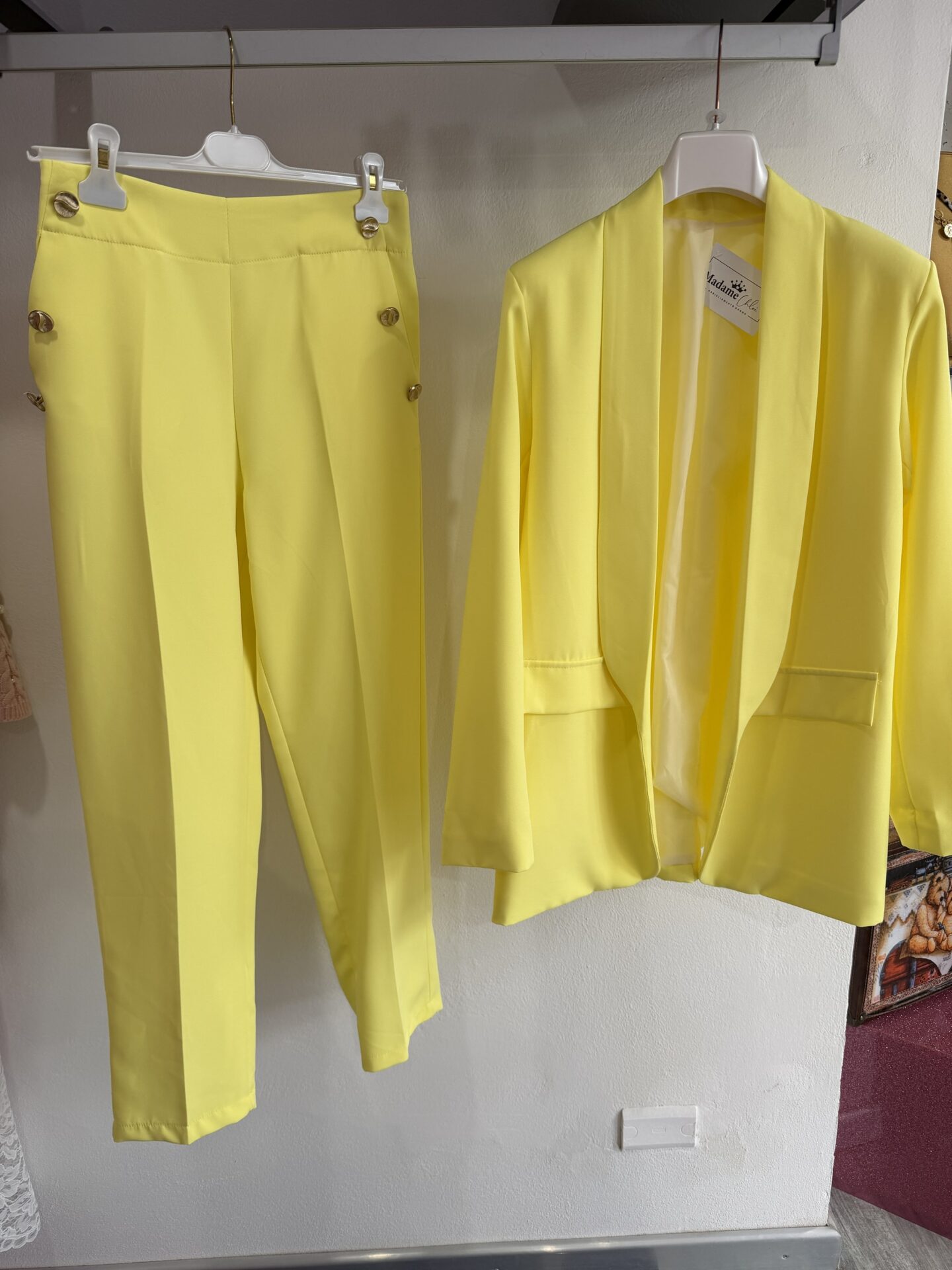Tailleur moderno destrutturato, composto da blazer senza bottoni, morbido e dalla linea molto fluida, a differenza del classico tailleur. Realizzato in tessuto leggero.