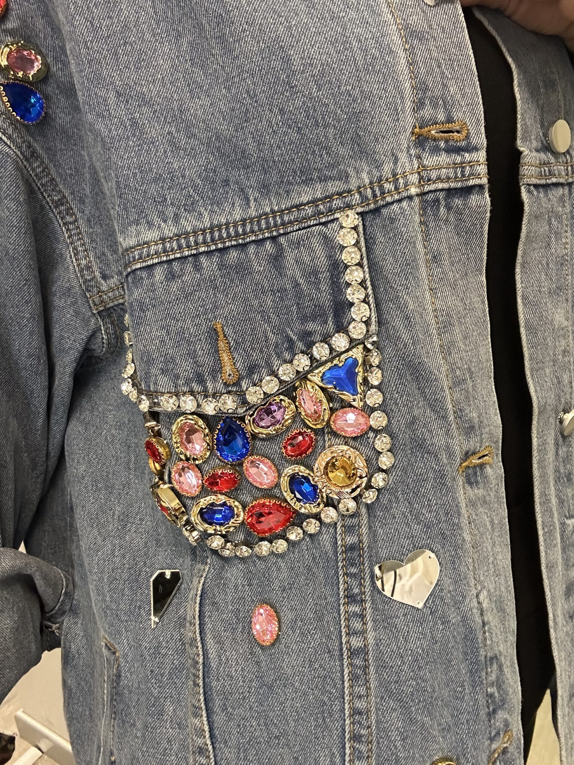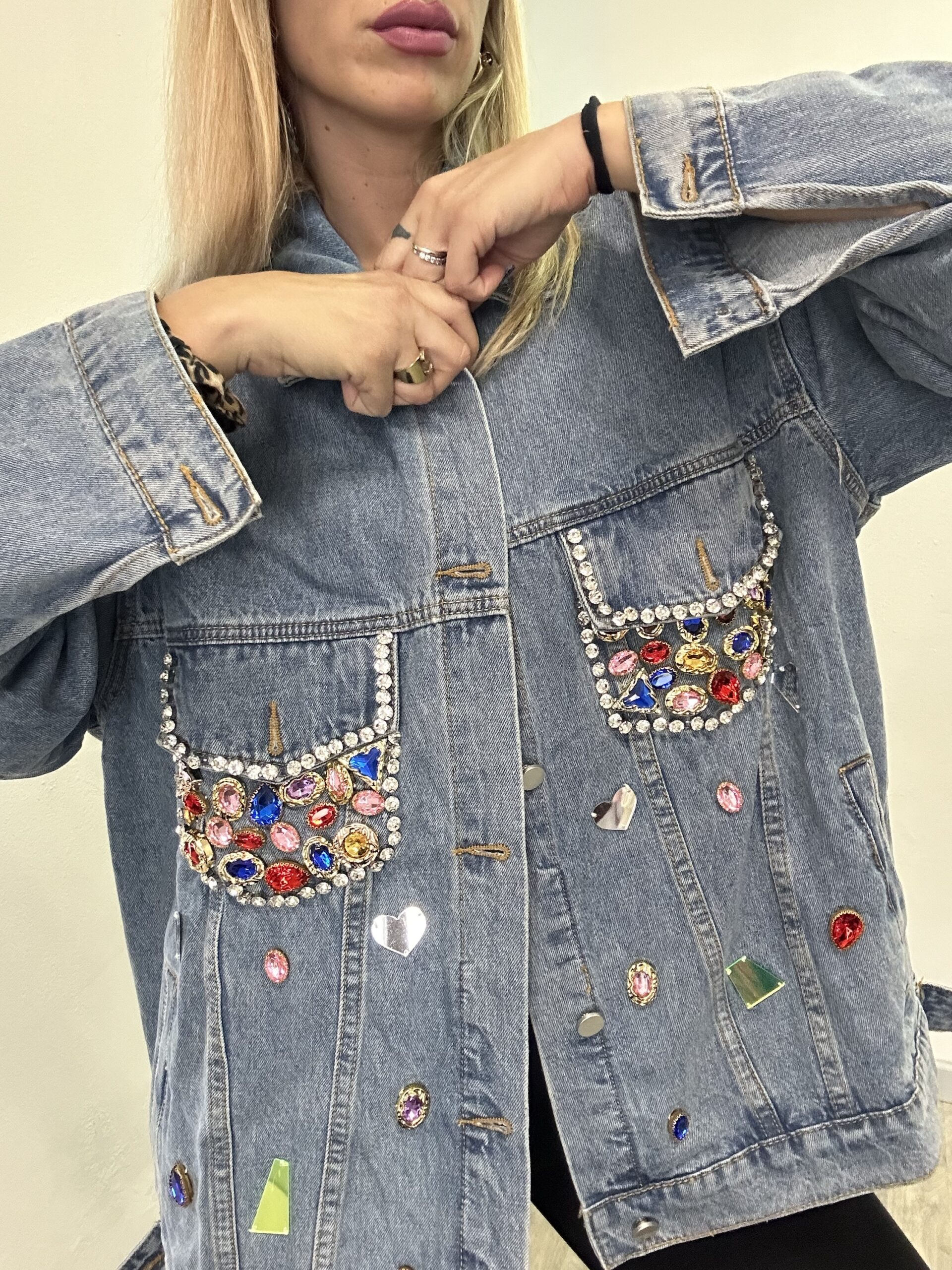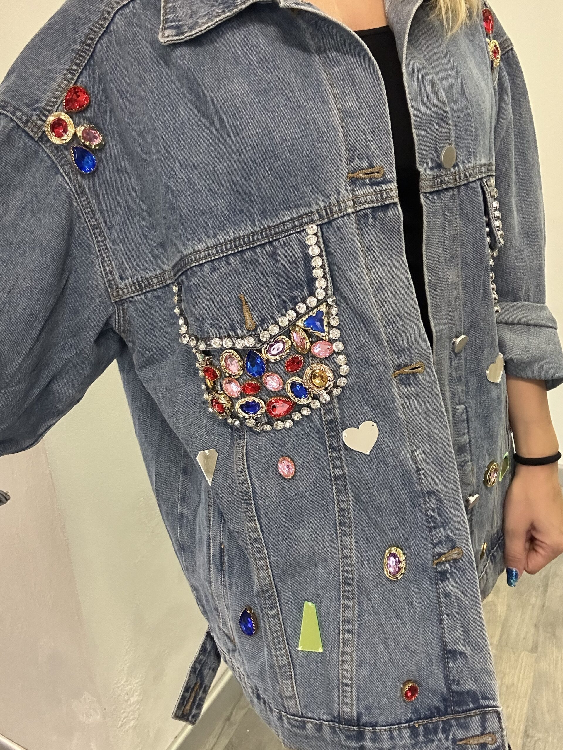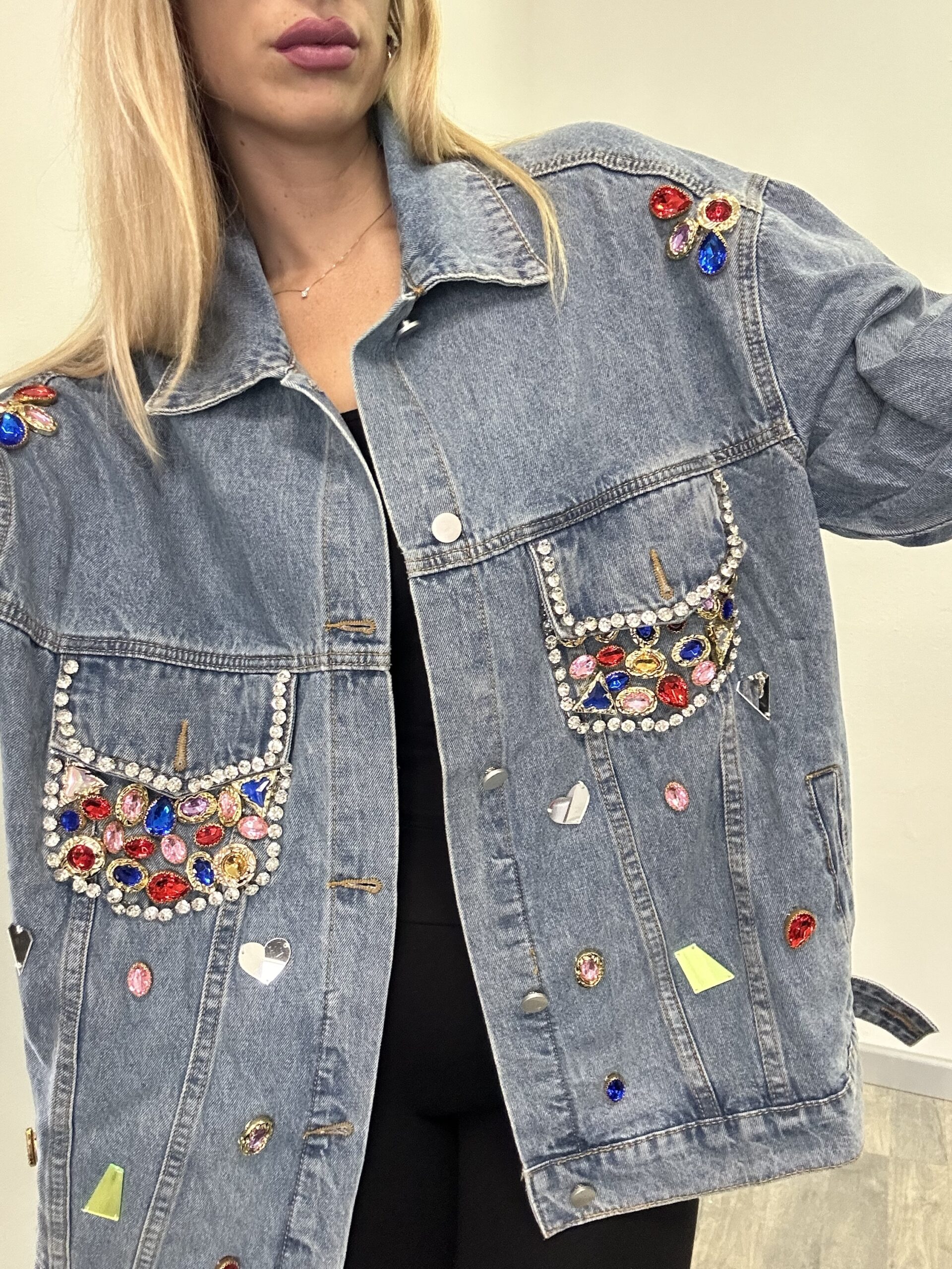 Molto particolare, con tutti i taschini con applicazione di pietre colorate e anche intorno alla camicia varie applicazioni