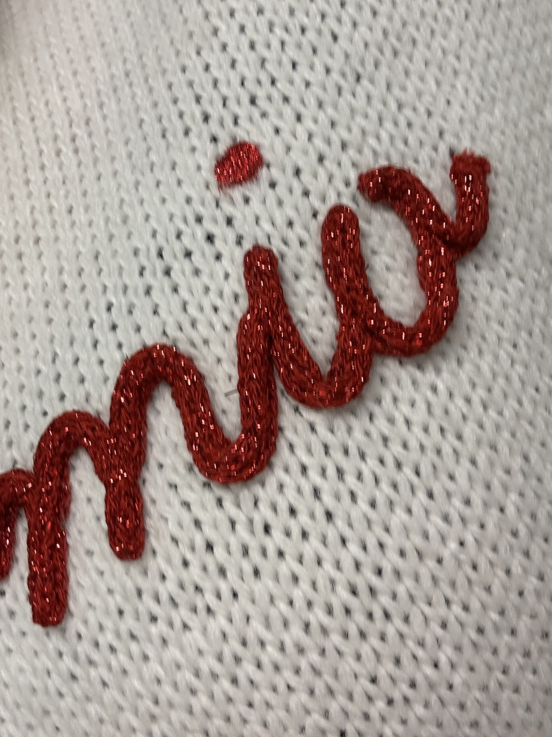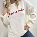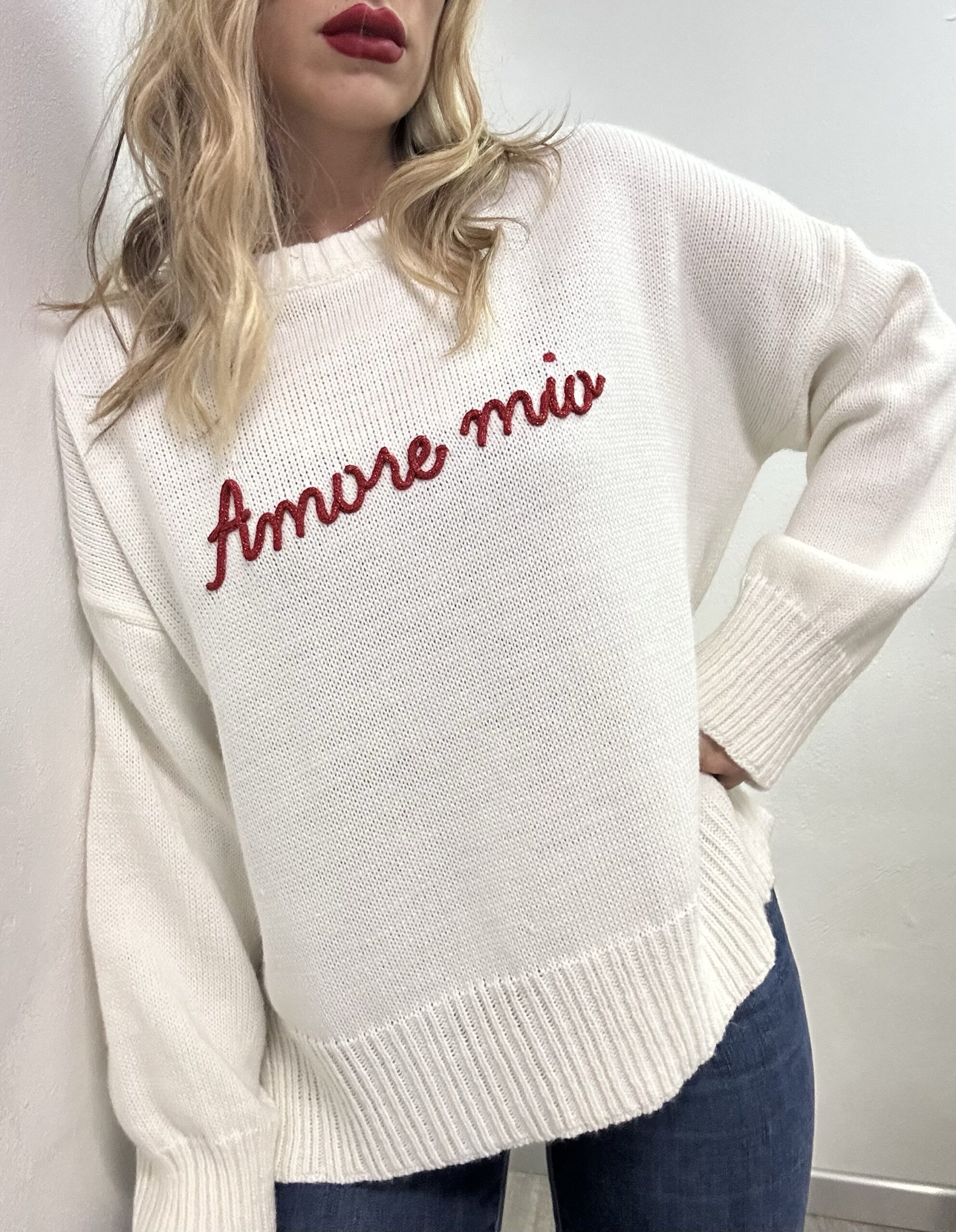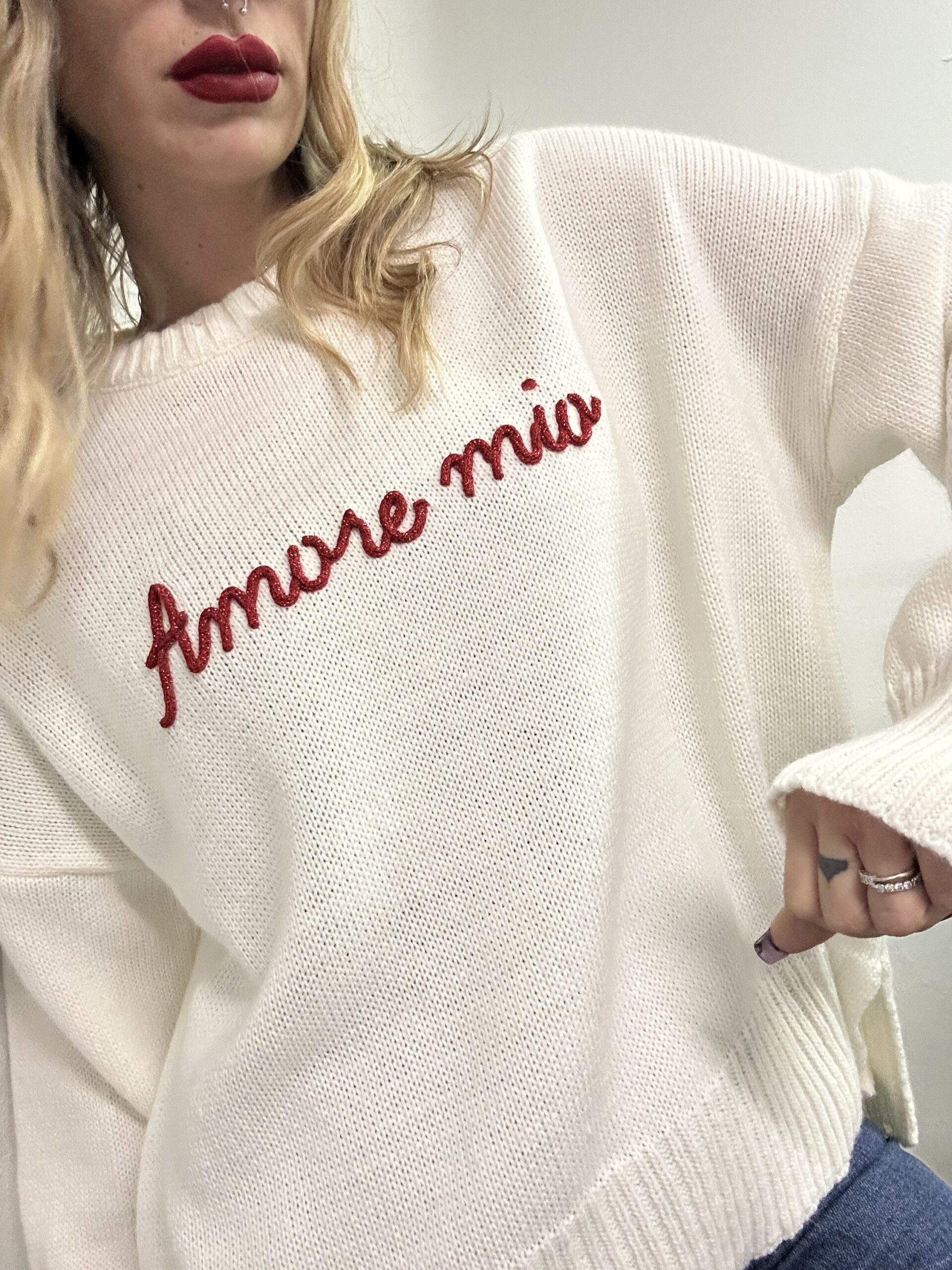 Maglione di Lumina con ricamato la scritta Amore mio rossa con lamè.