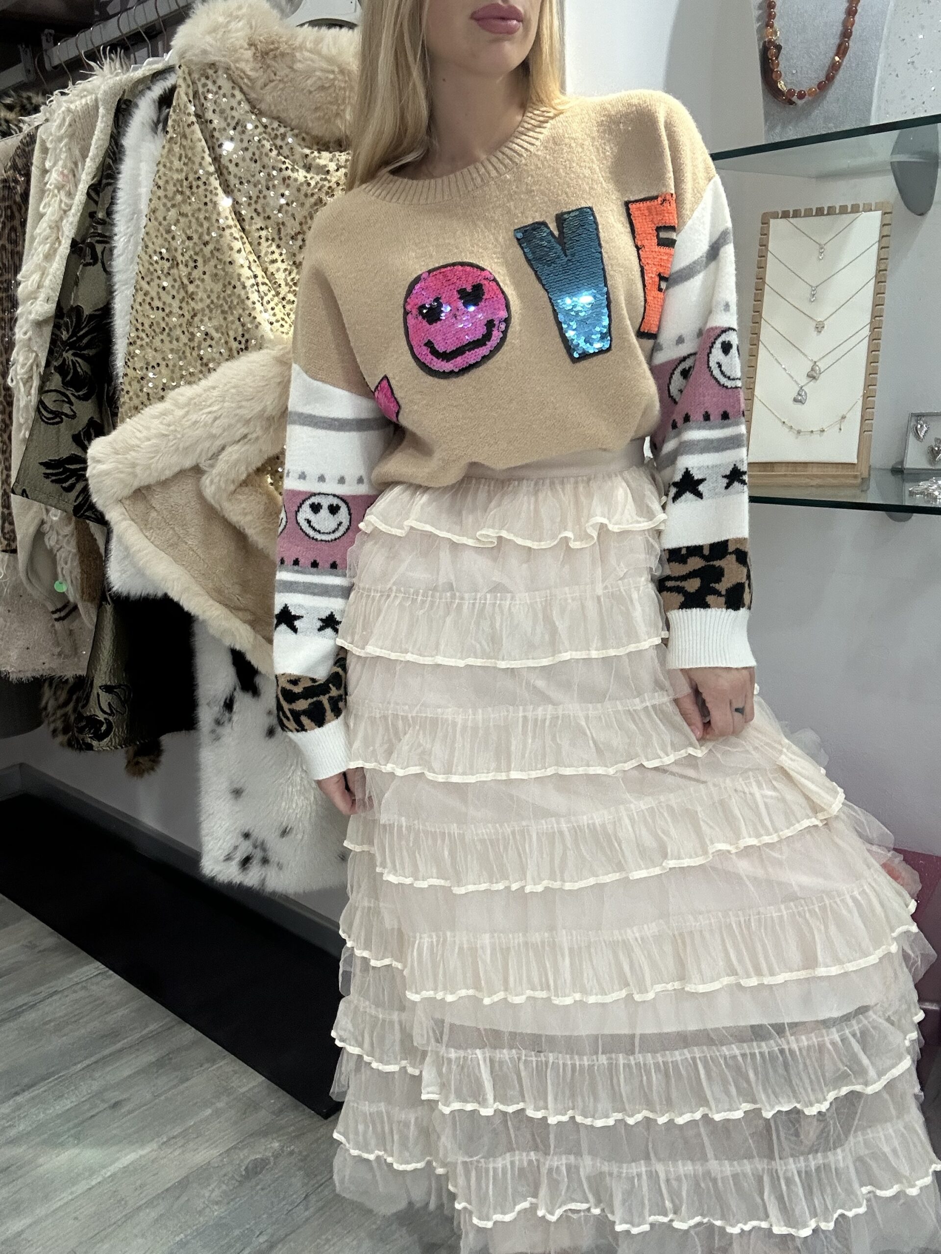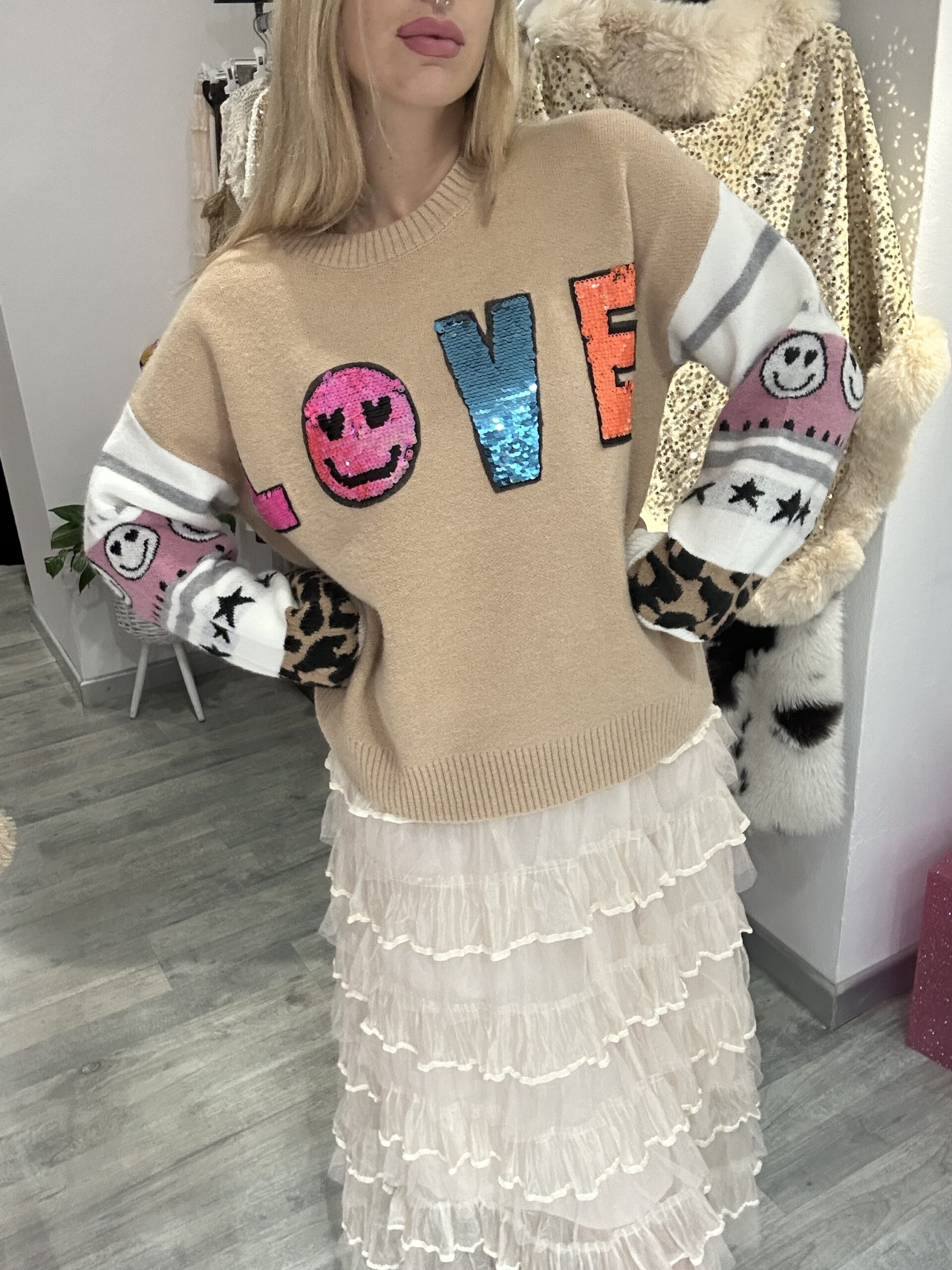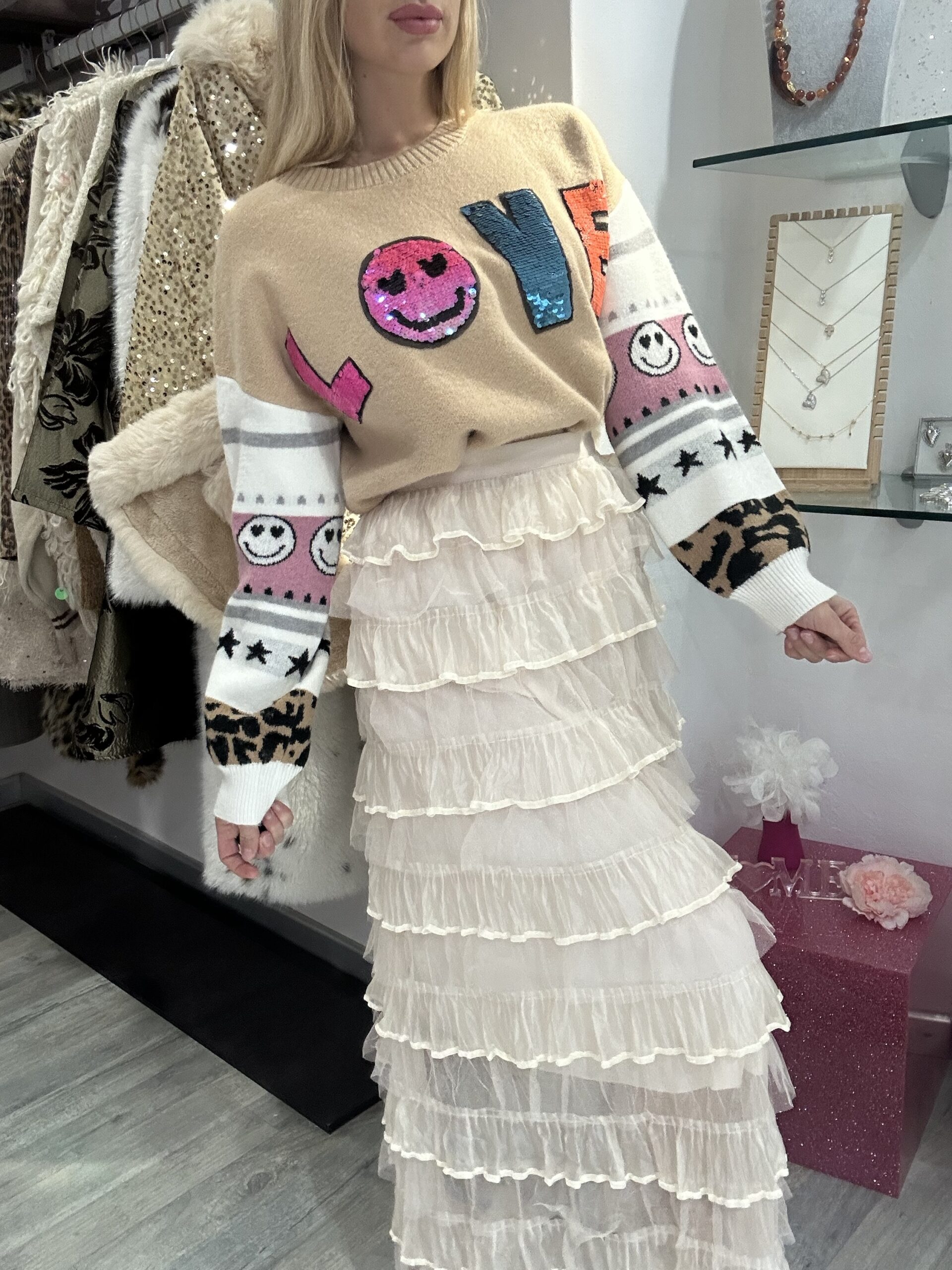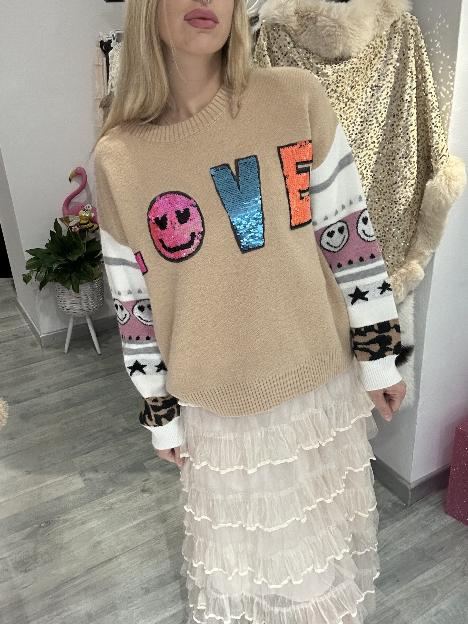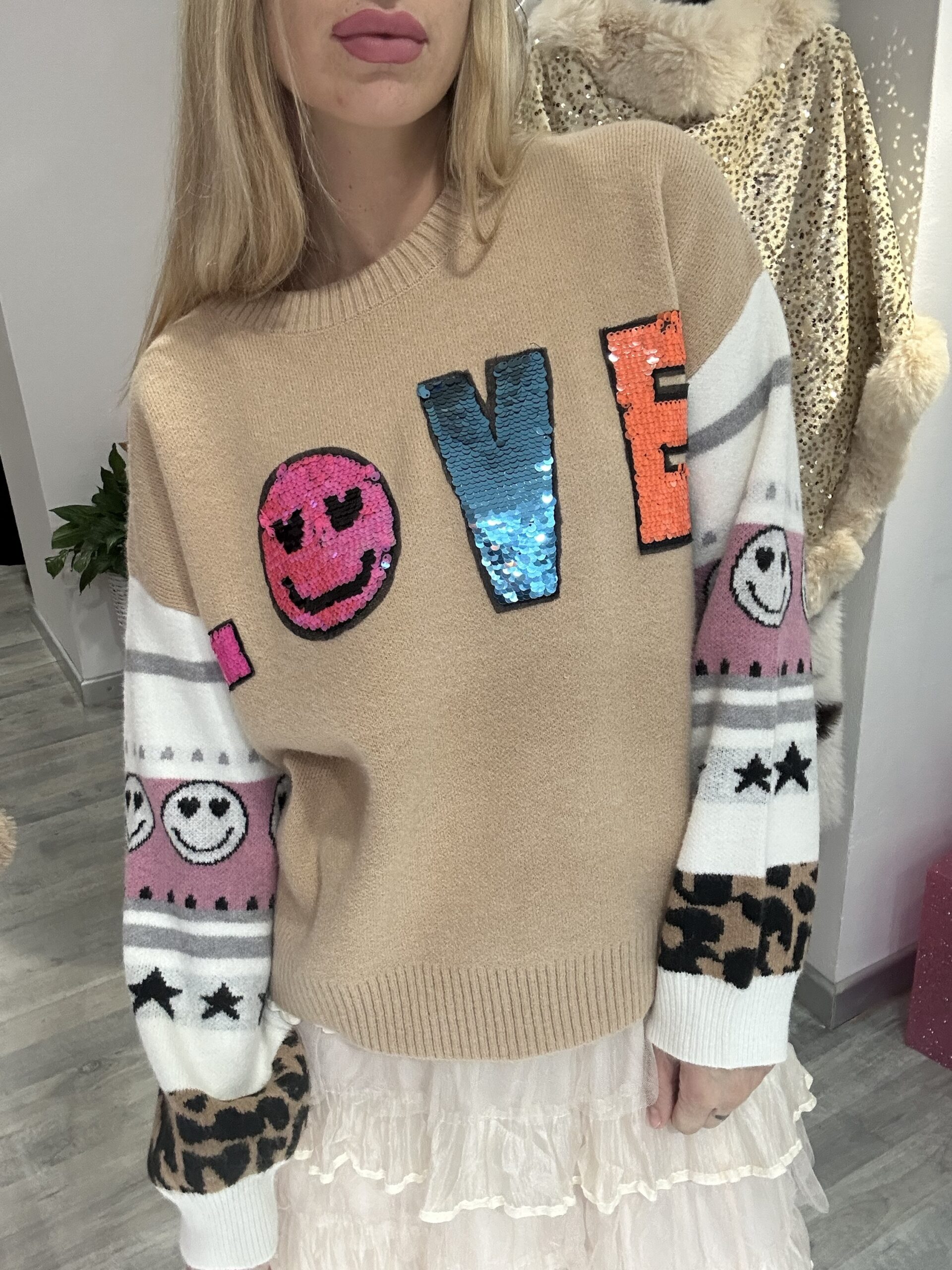 Simpatico maglione con applicazione di scritte palettate, particolarità di avere tutte le maniche colorate .