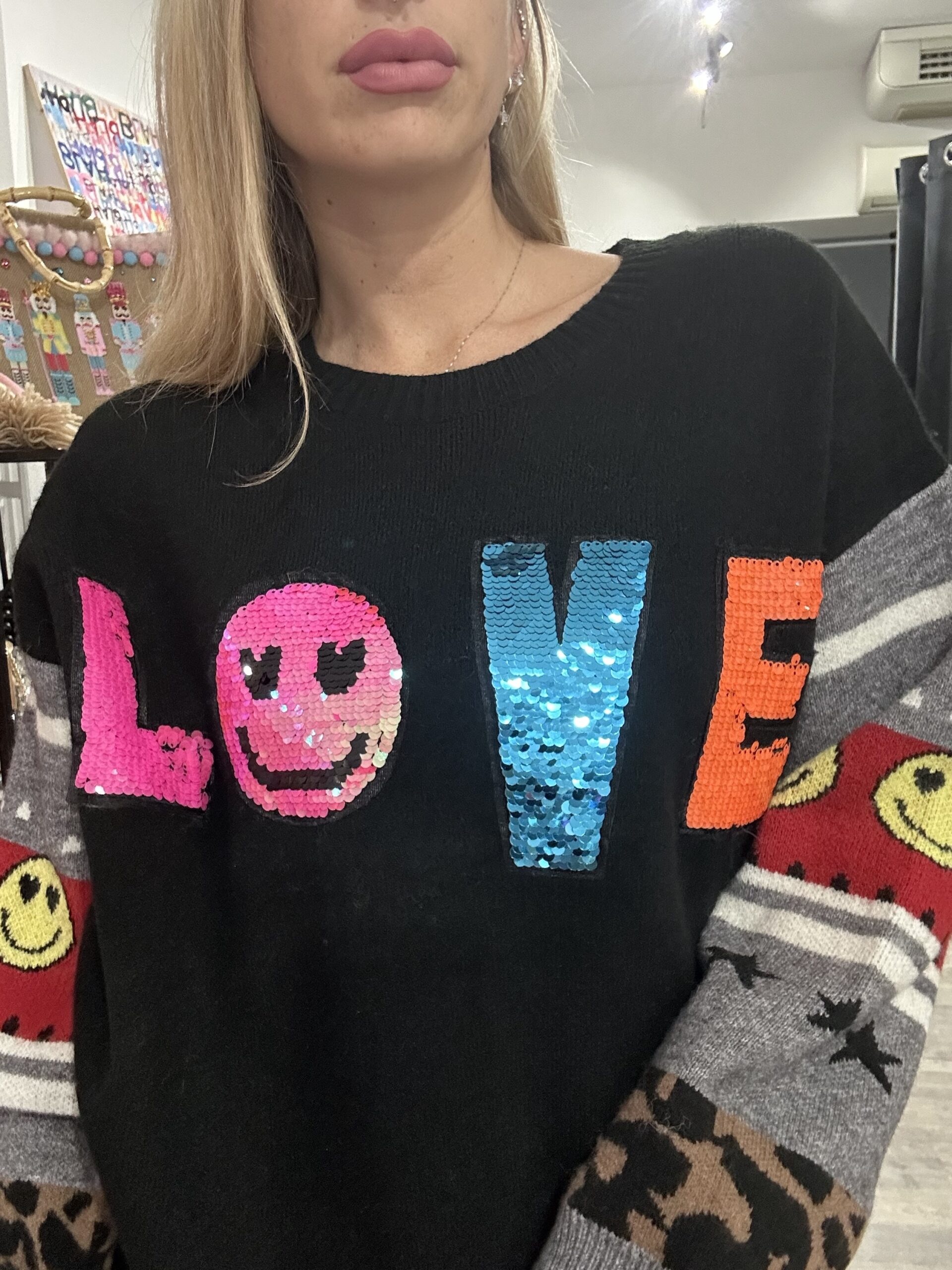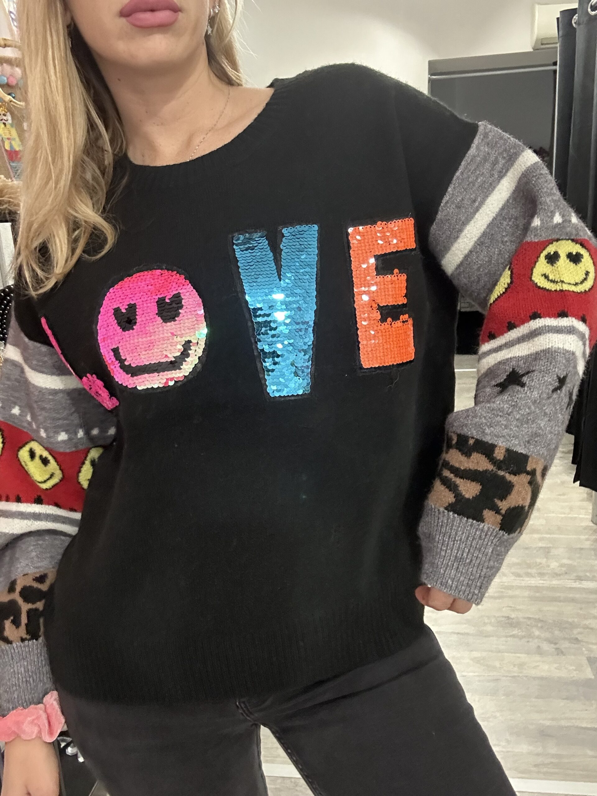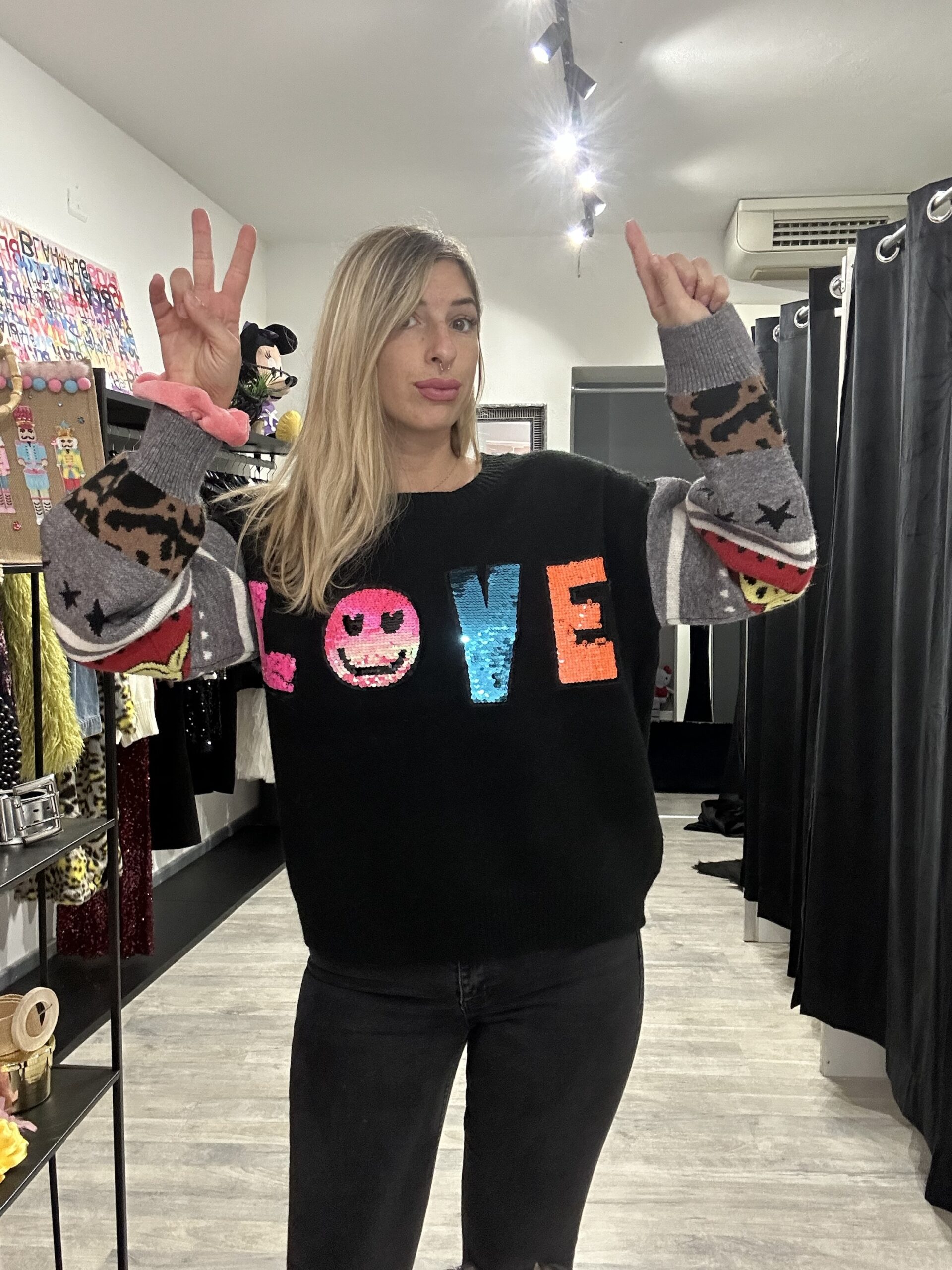 Simpatico maglione con applicazione di scritte palettate, particolarità di avere tutte le maniche colorate .