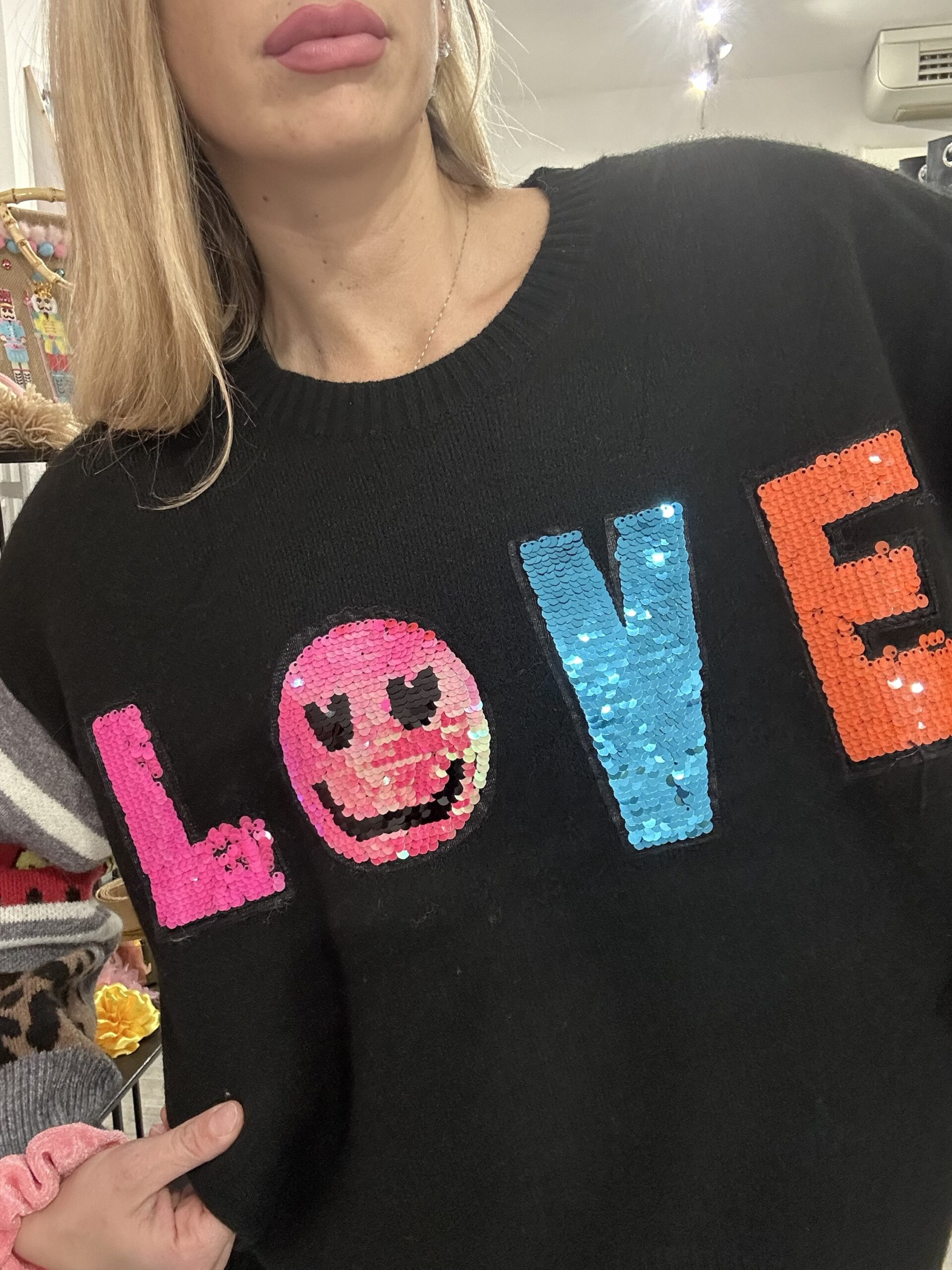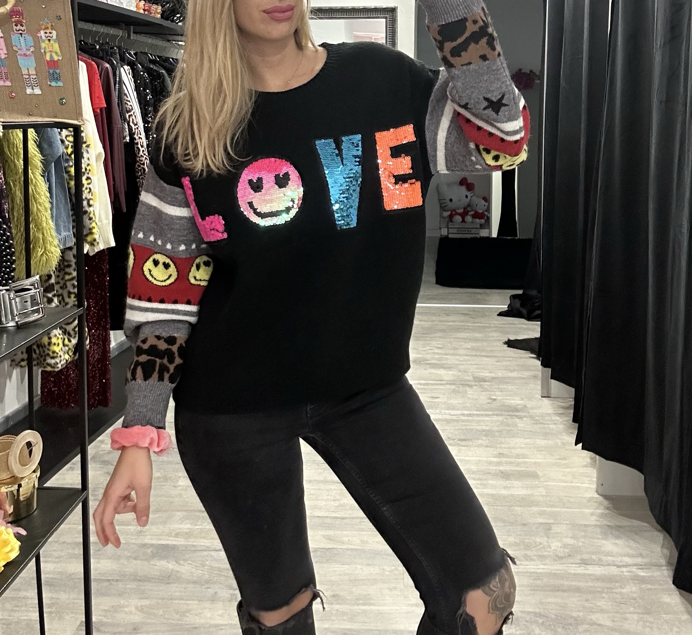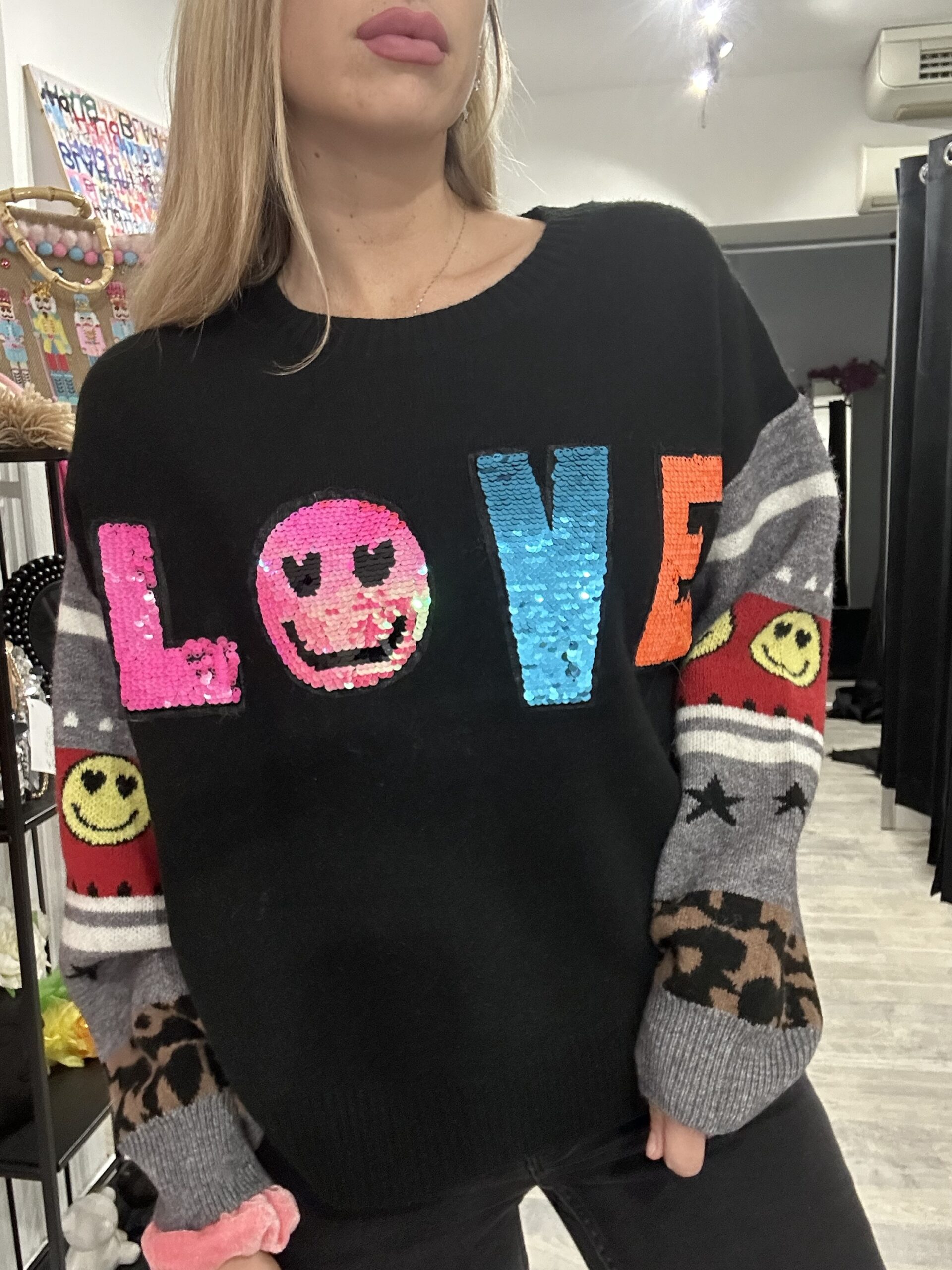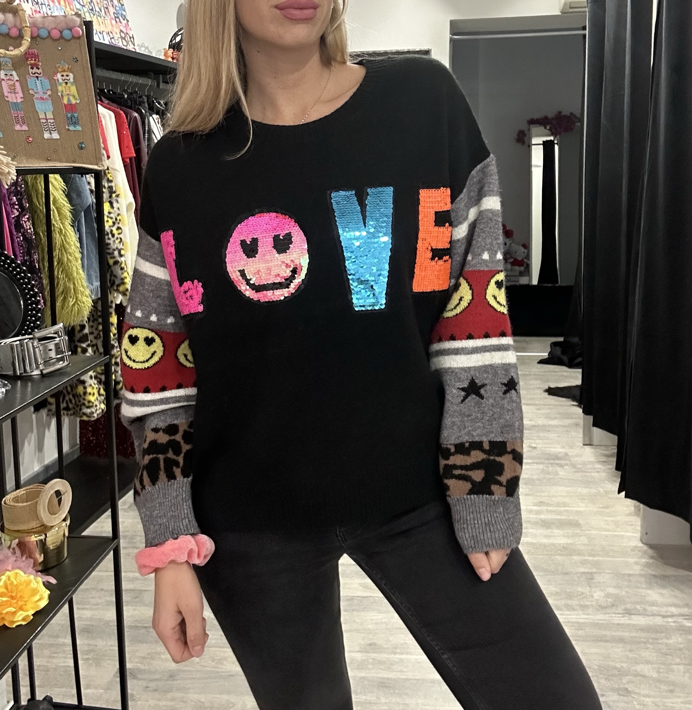 Simpatico maglione con applicazione di scritte palettate, particolarità di avere tutte le maniche colorate .