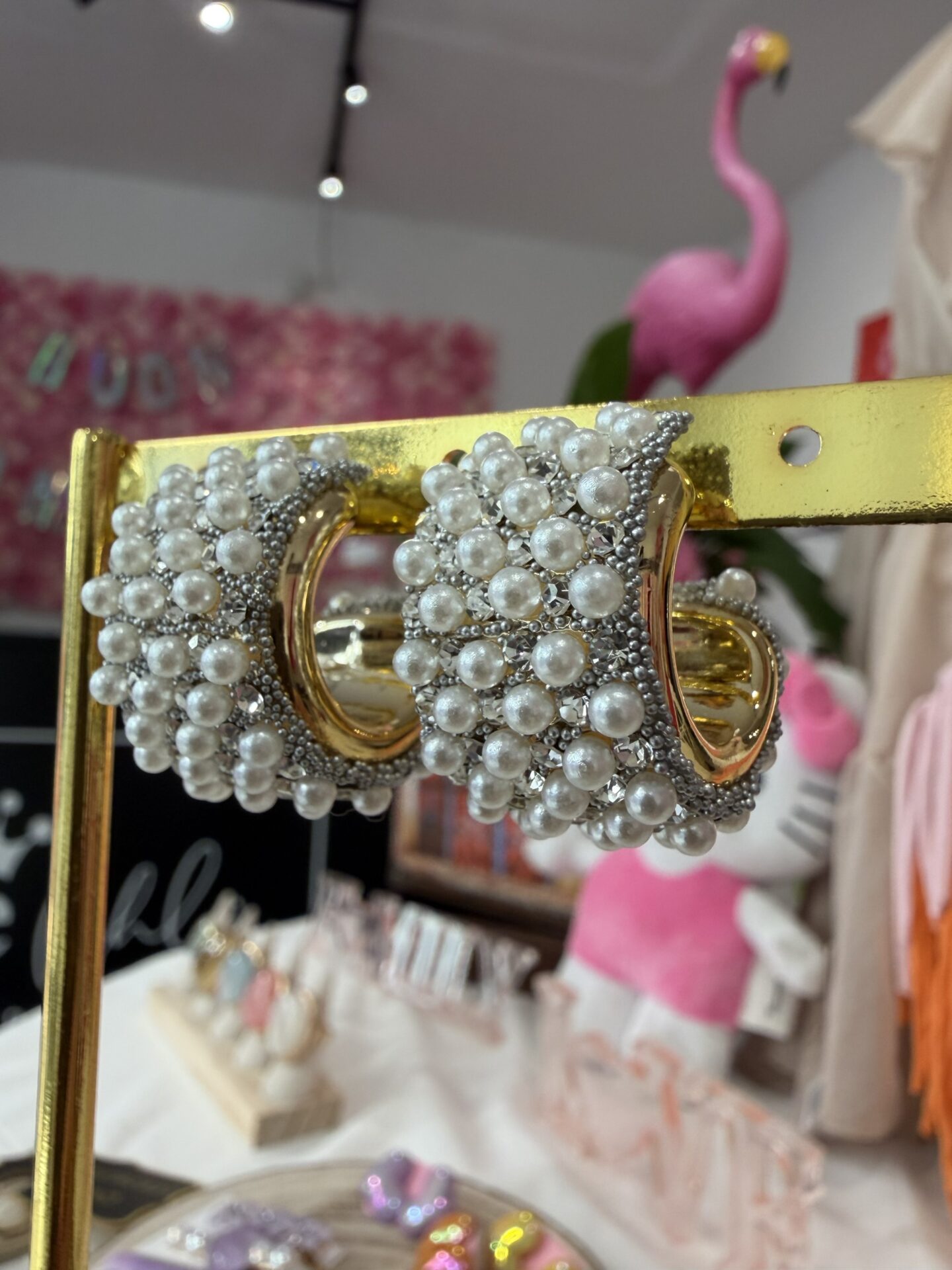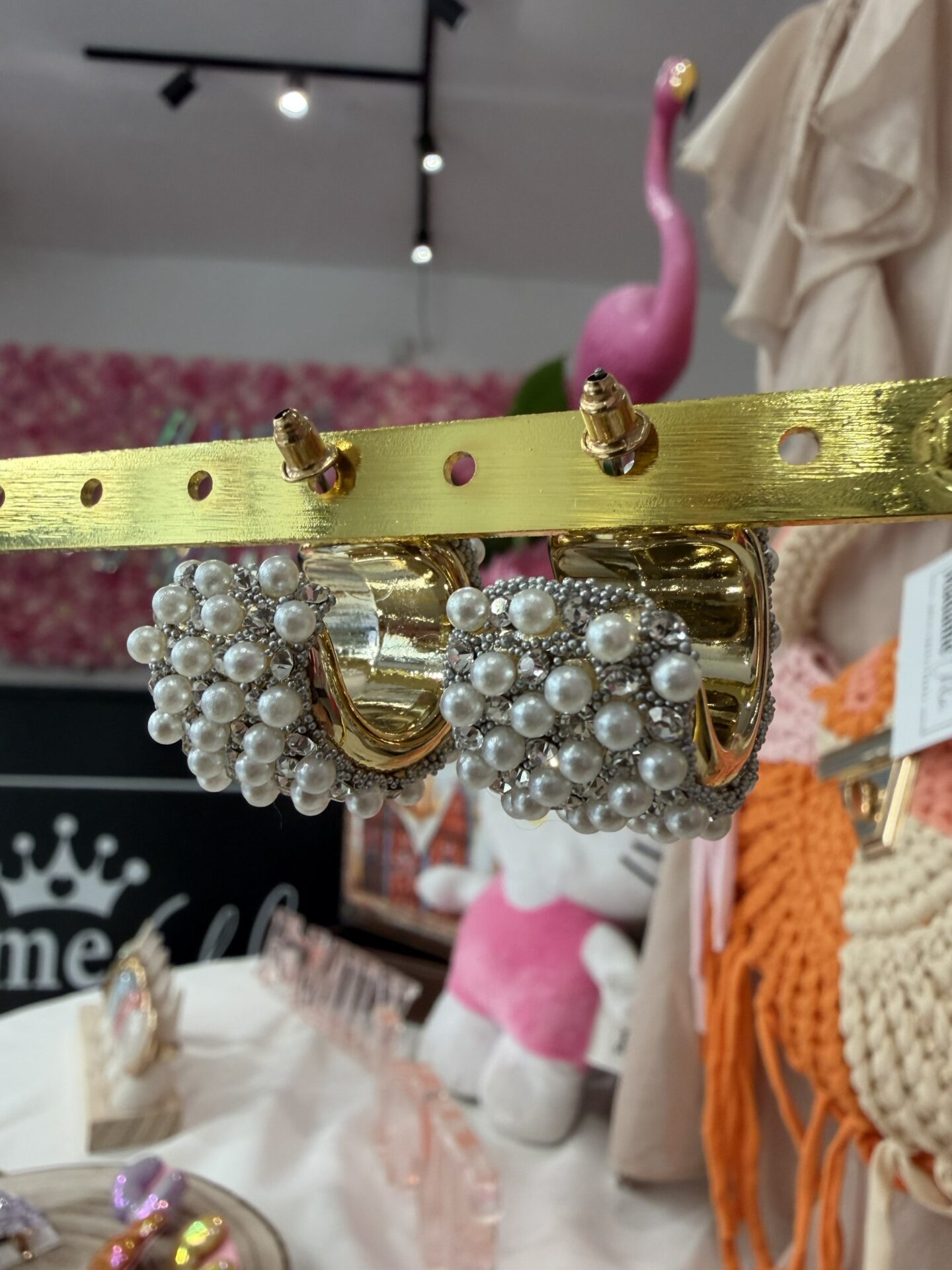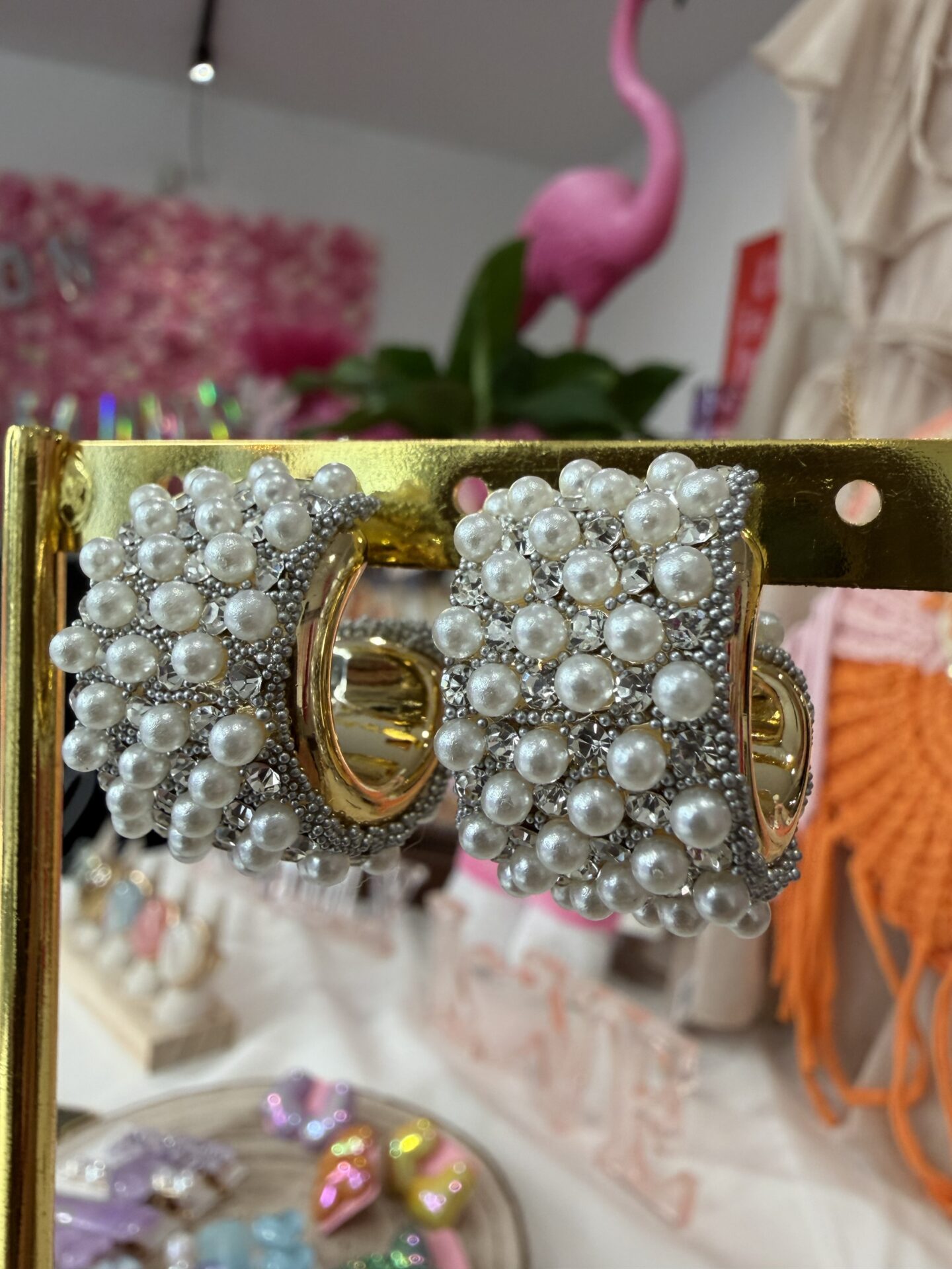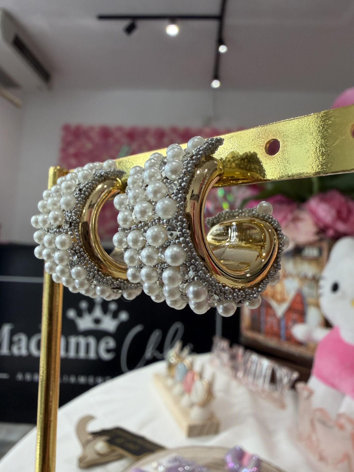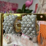 Questi orecchini a fascia bombata fondono la lucentezza delle perle con il brio degli strass, creando un accessorio scenografico ma incredibilmente leggero.
