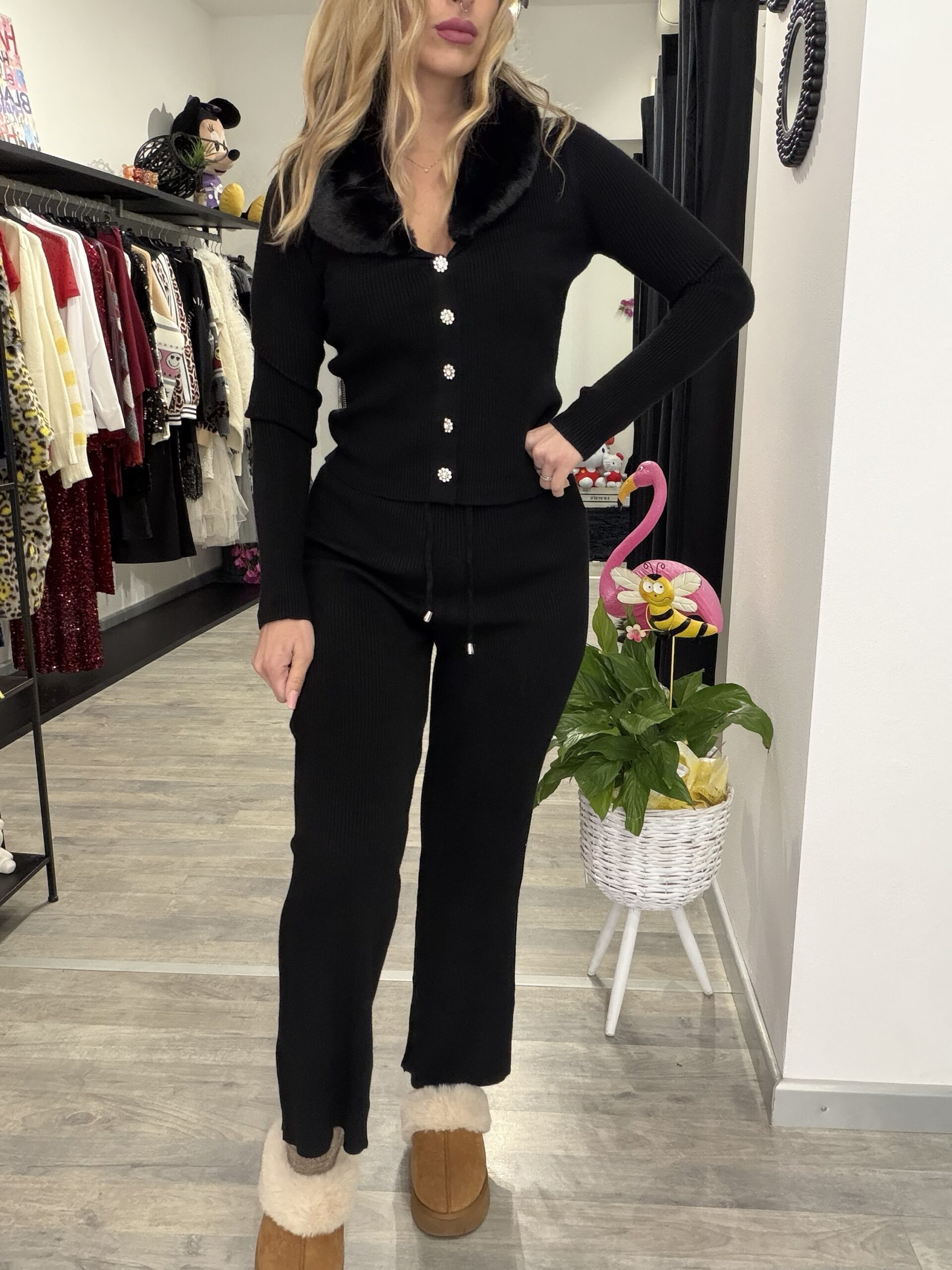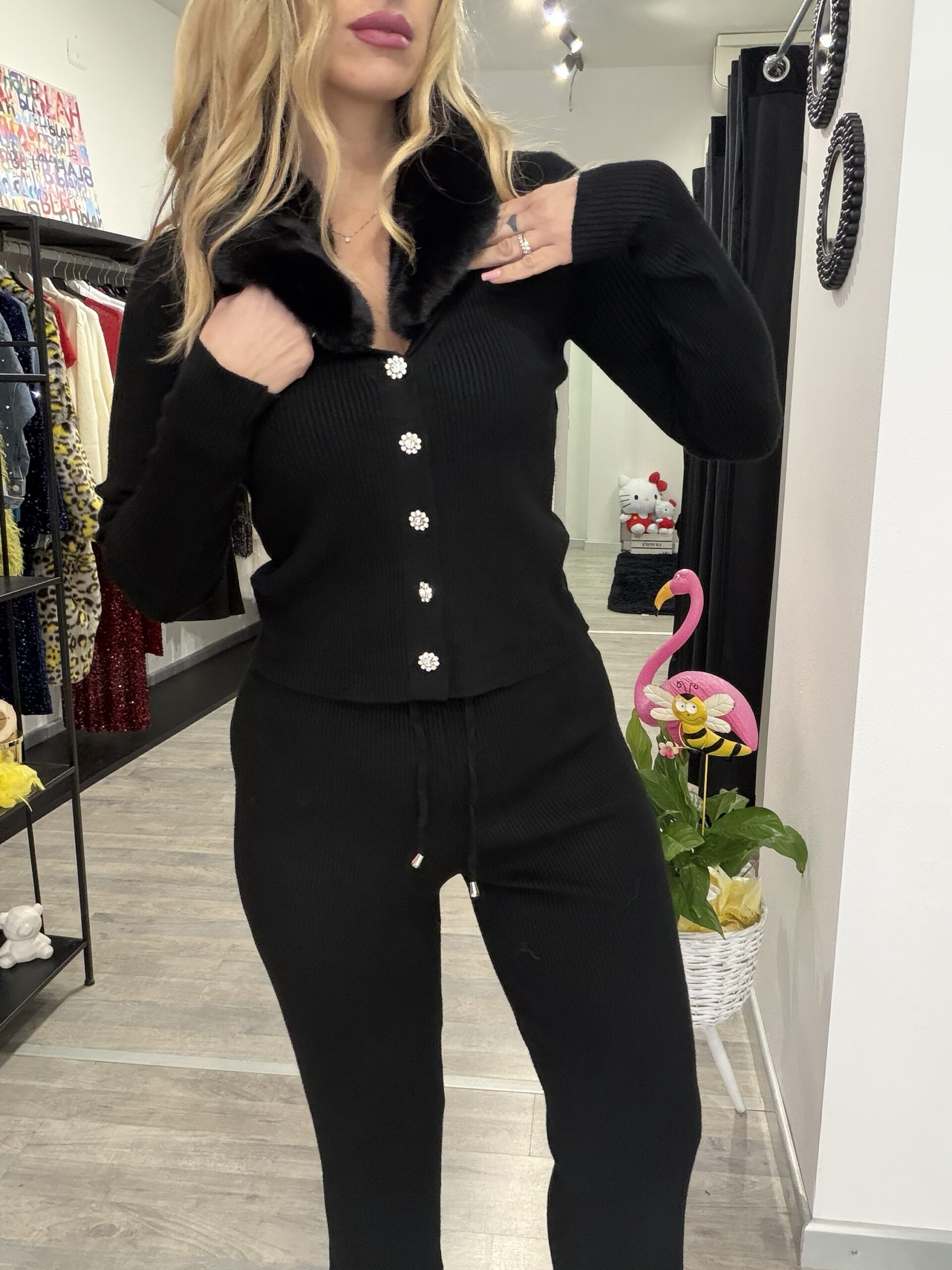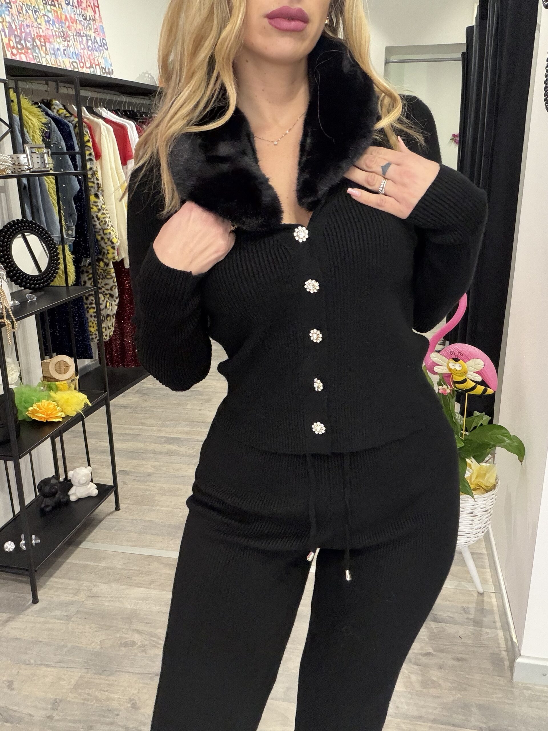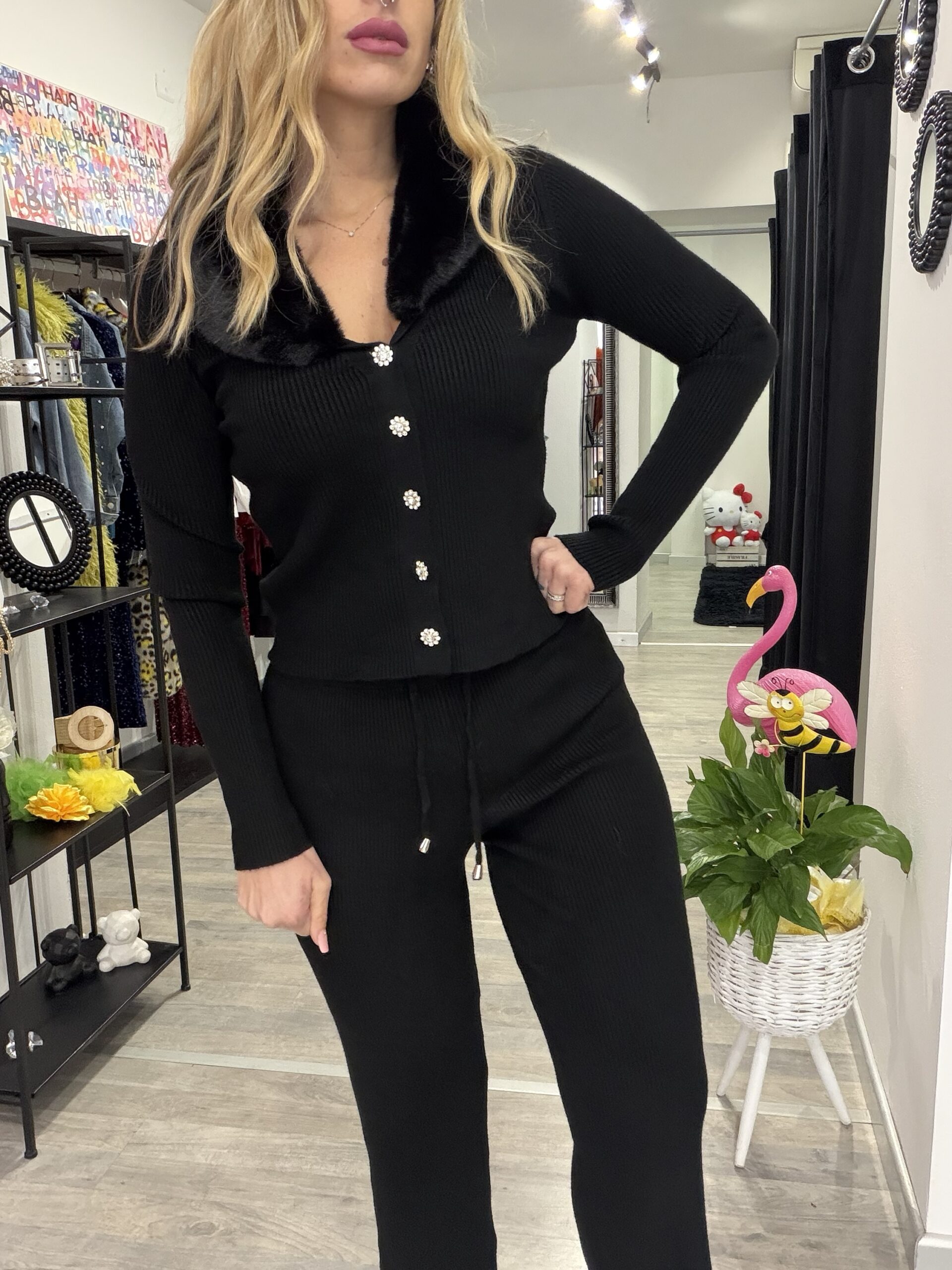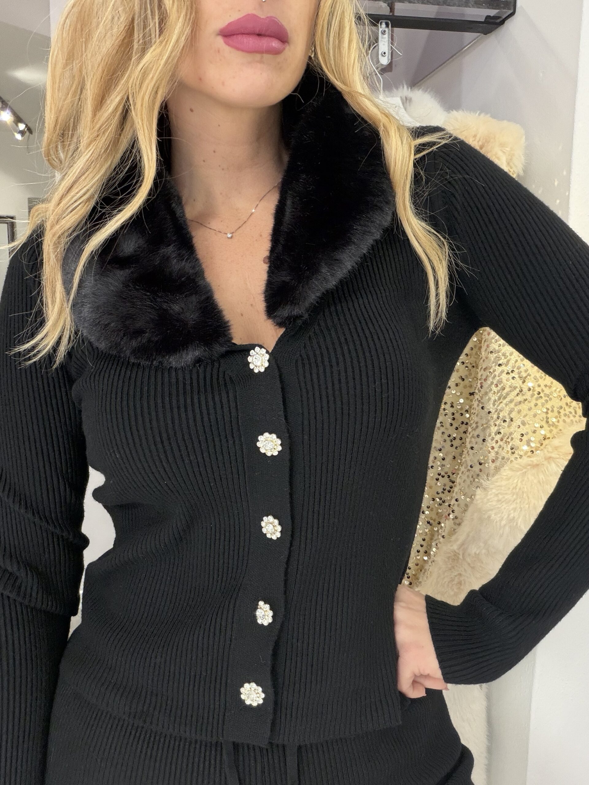Può essere usata anche per uscire a cena con questo bottone color gioiello e colletto con eco
